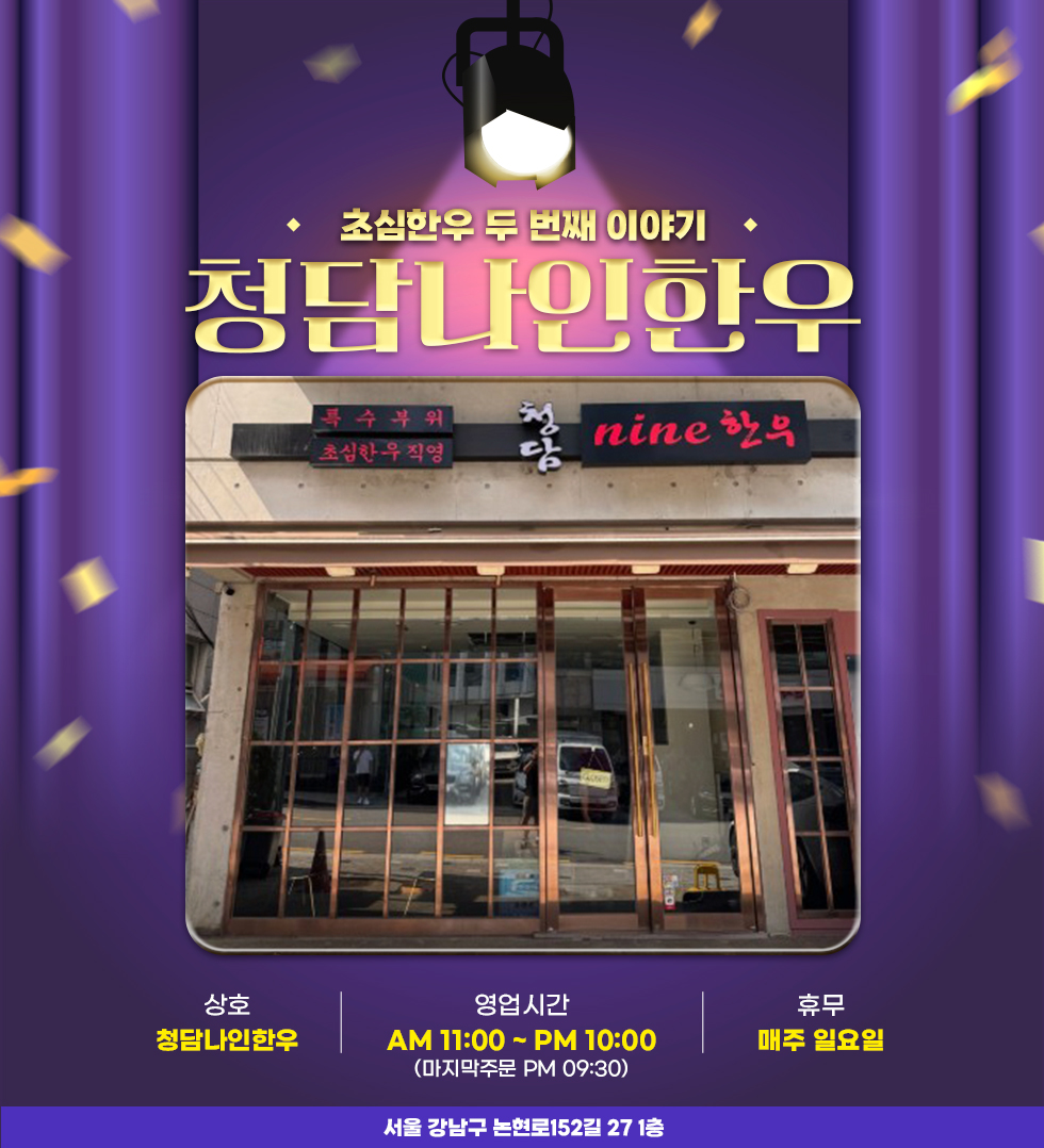 청담나인한우 | 0507-1377-7752 | 주소 : 서울 강남구 논현로152길 27 1층 | 대표자 : 김준엽